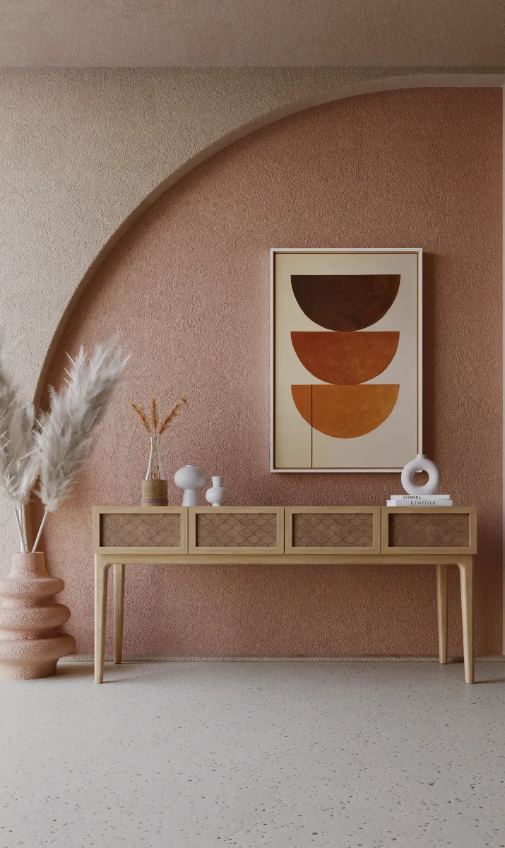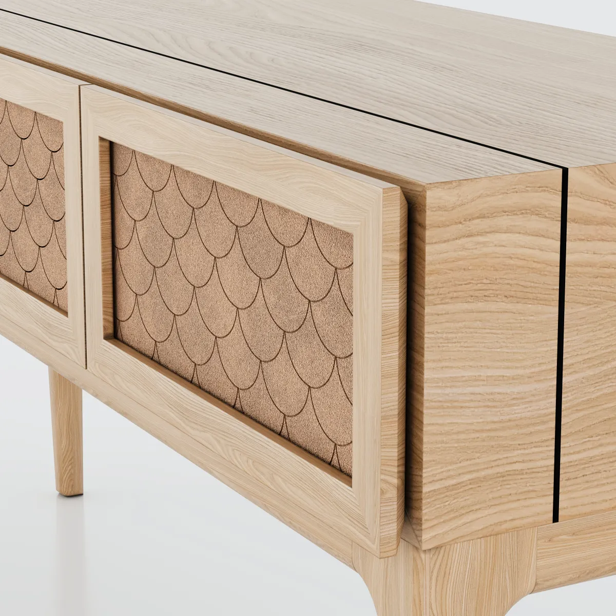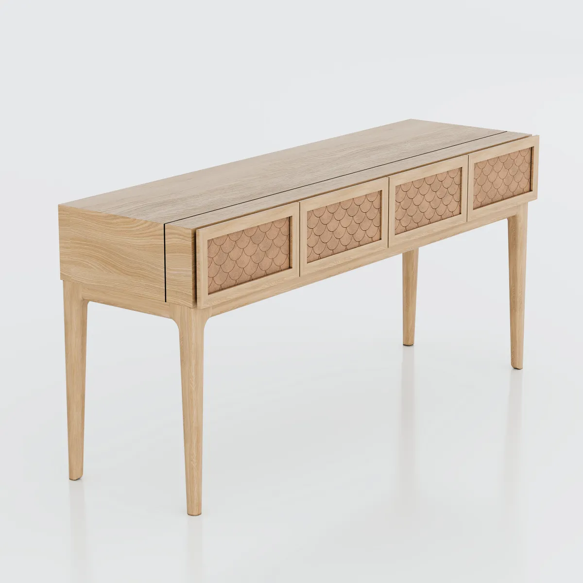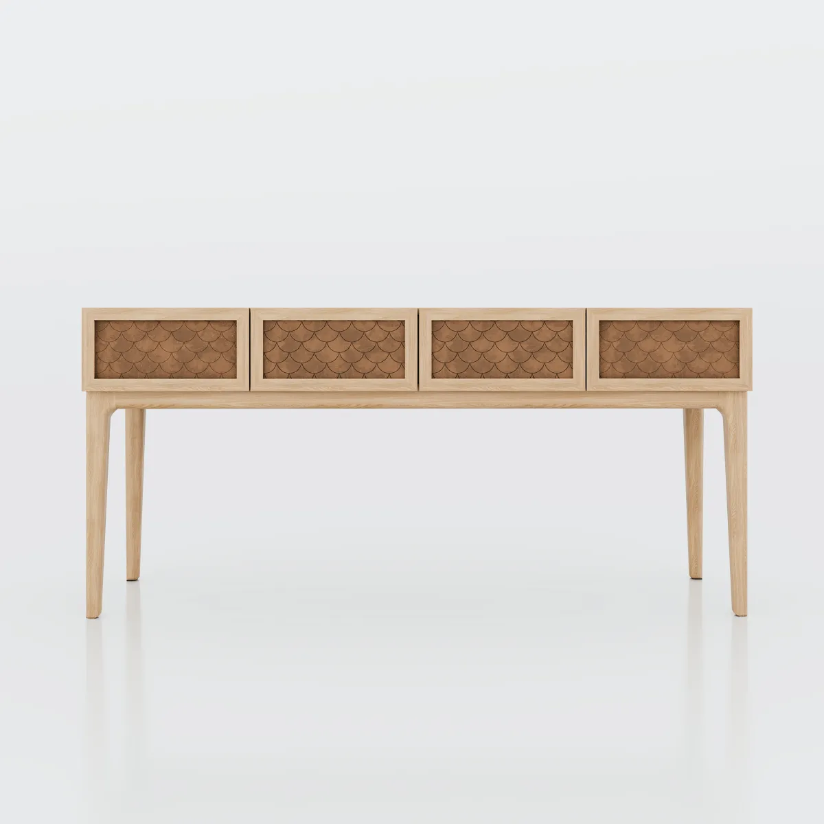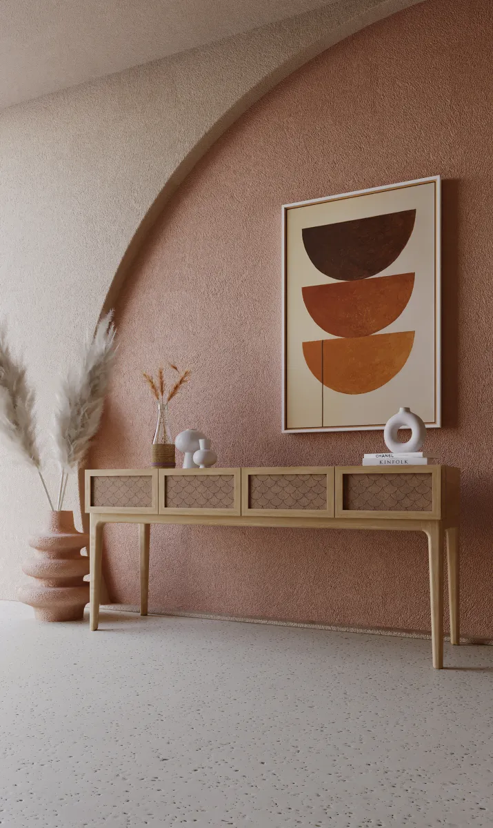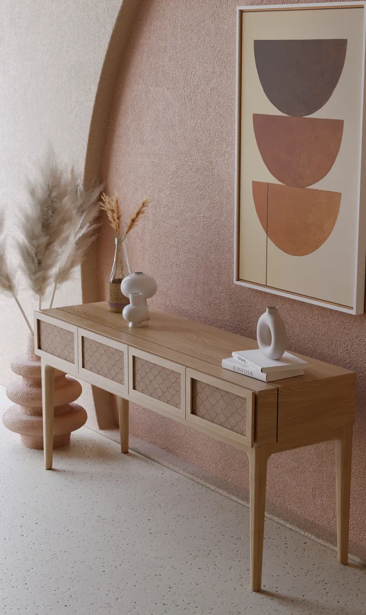 A escolha do couro para o revestimento das gavetas não é apenas estética, mas também funcional, criando uma superfície nobre e durável. Os pés em madeira maciça garantem estabilidade e conferem elegância ao conjunto. O Scala é perfeito para halls de entrada, salas de jantar e ambientes corporativos que buscam sofisticação.