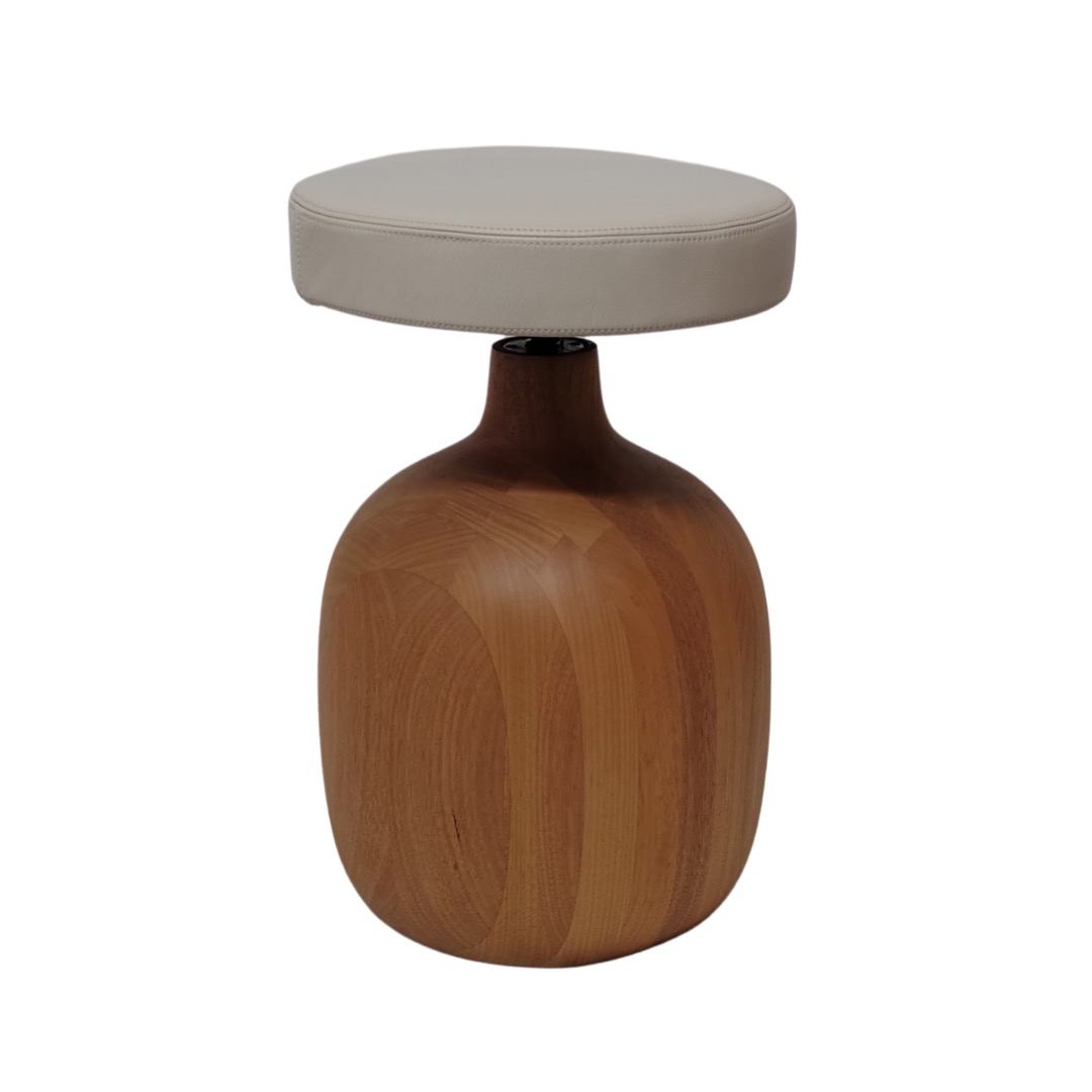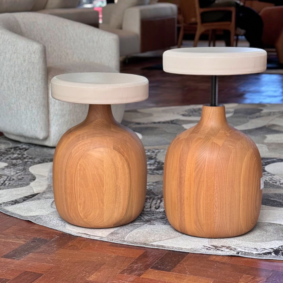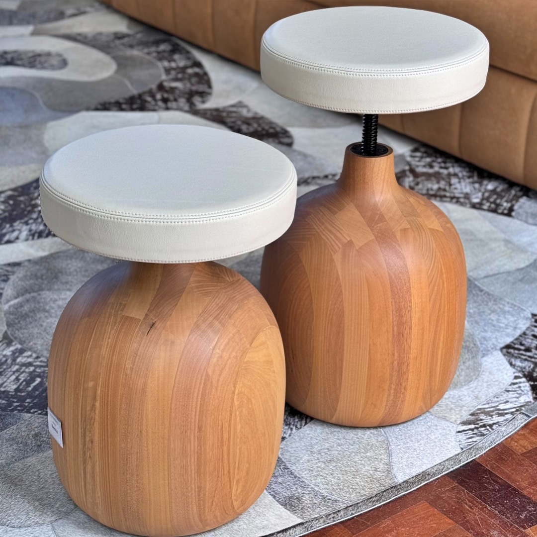 O Banco Bacco é uma peça escultural que une funcionalidade e arte. Sua base em madeira maciça torneada é um verdadeiro trabalho de marcenaria artesanal, criando um jogo que confere leveza visual a uma estrutura sólida.