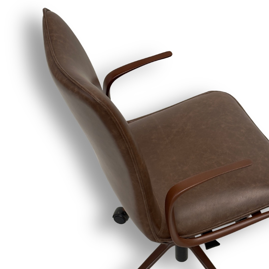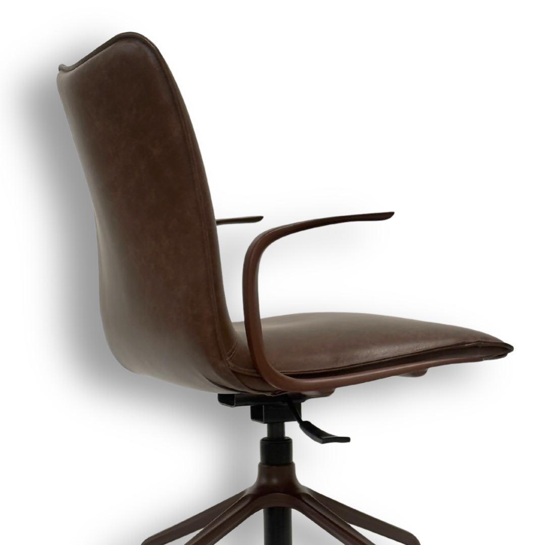 A estrutura giratória em aço carbono com acabamento preto fosco adiciona mobilidade e sofisticação, enquanto o encosto em concha e o assento estofado garantem conforto ergonômico e bem-estar. Com braços integrados ao design, a peça ganha funcionalidade e equilíbrio visual, tornando-se ideal para ambientes que valorizam desempenho, estética contemporânea e design autoral.