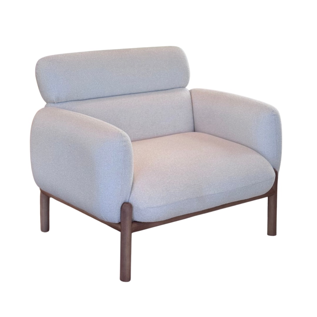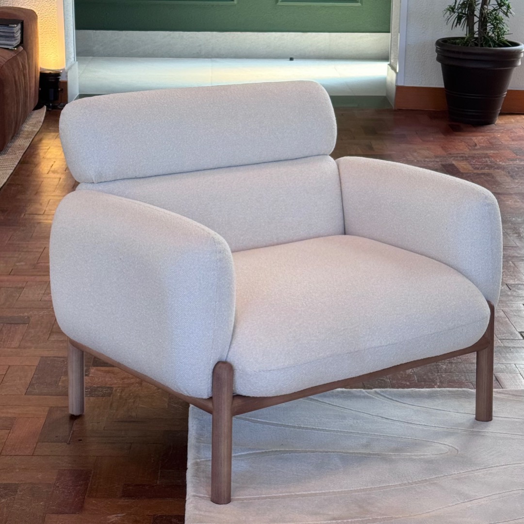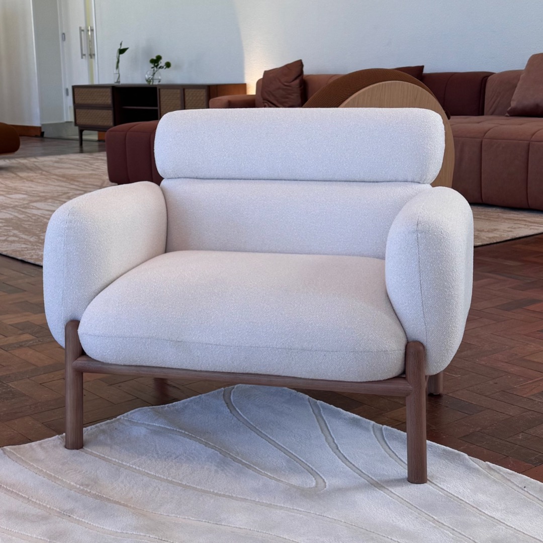 Visualmente, o conforto é sustentado por uma base mínima de madeira, que eleva a forma acolchoada ao ar, mantendo a estética minimalista e elegante.
